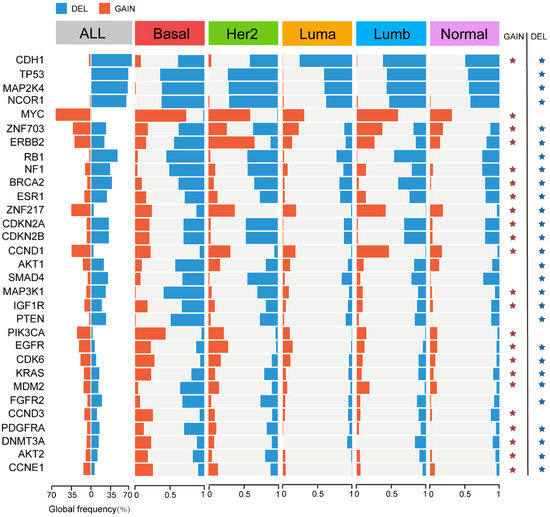 To comprehensively explore the genomic abnormalities in breast cancer, we further analyzed the CNA rates of 31 known copy number driver genes [44] in different molecular subtypes of breast cancer (Figure 6). The top five genes with the highest frequency of CNV across all breast cancer samples were CDH1 (63%), TP53 (55%), MAP2K4 (54%), NCOR1 (53%), and MYC (52%). The first four genes mainly experienced deletion variants and MYC mainly experienced amplification variants, and the amplification or deletion of these genes was specific among different subtypes (FDR < 0.01). CDH1 had the highest frequency of deletion in the Luminal A subtype compared to other subtypes, and TP53, MAP2K4, and NCOR1 were more likely to occur in the HER2-enriched subtype with copy number deletion. The Basal-like subtype was significantly associated with higher frequency amplification levels for MYC.