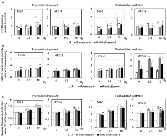 Measurements of the intracellular redox state, mitochondrial ROS and •OH. The relative fluorescence intensity values of the DCFDA (A), MitoSOX-red (B), and OxiORANGE (C) were normalized to non-irradiated controls. TIG-3 and MRC-5 cells were stained 1 day after X-ray exposure. Asterisk indicates a significant change in fluorescence intensity value of the staining in IR+ melatonin group and IR+ MitoEbselen-2 group compared with that of IR groups at same Gy level.