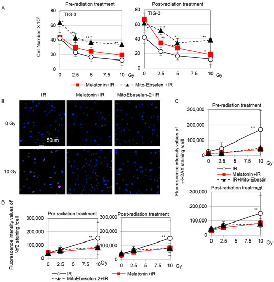The number of cells in TIG-3 cells was counted 3 days after irradiation to evaluate the protective role of melatonin and MitoEbselen-2 on cell growth (Figure 3A). When cells were exposed to radiation doses >2.5 Gy, their growth was inhibited in a dose-dependent manner. In contrast, melatonin-treated cells showed growth inhibition at >5 Gy, but MitoEbselen-2-treated cells showed no growth retardation. Thus, combining radiation with melatonin or MitoEbselen2 reduced the effect of radiation on cell growth. Similar results were obtained in MRC-5 cells (Supplementary Figure S1). Radiation-induced DNA double strand breaks were examined by using a marker γ-H2AX. γ-H2AX foci were found 24 h after 10-Gy irradiation (Figure 3B). In contrast, pre-radiation and post-radiation melatonin or MitoEbselen-2 treatment did not significantly increase γ-H2AX fluorescence levels (Figure 3C). We further examined the Nrf2-mediated antioxidant response. Radiation alone activated Nrf2, as evidenced by nuclear accumulation of Nrf2 in TIG-3 cells (Figure 3B). Radiation with pre-radiation and post-radiation melatonin or MitoEbselen-2 treatment did not induce such Nrf2 radiation responses (Figure 3D).
