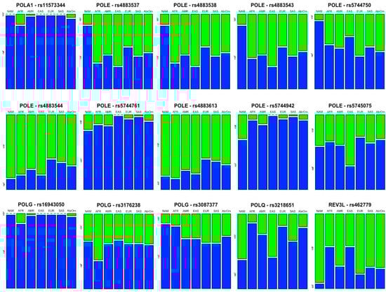 Additionally, recent studies have shown that Amerindian ancestry can modulate the predisposition to certain diseases, which means that knowledge of their molecular profile has a relevant impact not only for these populations, but also for admixed populations with strong Amerindian ancestry, as in the case of the Brazilian population [,,,,]. Thus, the aim of this study is to characterize the molecular profile of POLA1, POLE, POLG, POLQ, and REV3L genes in Amerindian populations from the Brazilian Amazon, comparing these findings with genomic data from five continental populations described in the gnomAD database, and with data from the Brazilian population described in ABraOM.