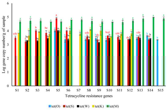 Average tetracycline resistance genes’ Log copy numbers per g of surströmming sample (S1–S5 (producer A), S6–S10 (producer B), and S11–S15 (producer C)) ± standard deviation. For each target gene, different letters indicate significant differences among samples (p < 0.05).