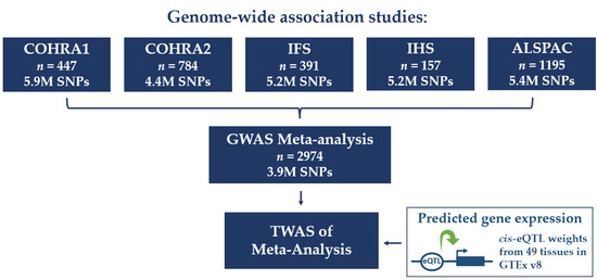Colocalization analysis was used to address the potential for spurious associations in TWAS results due to LD among variants used to predict gene expression. Here, the coloc R package was used to test for cis-QTL colocalization with GWAS signals. Program inputs were GTEx V8 eQTL data (gtexportal.org (accessed on 20 September 2021)) and GWAS summary statistics, limited to 1 Mb around the TWAS-identified genes. The posterior probabilities of five hypotheses were tested, H0: neither the GWAS-identified SNPs nor any eQTLs have associations in the region, H1: only SNPs show genetic association in the region, H2: only eQTLs show genetic association in the region, H3: both SNPs and eQTLs are associated but with different causal variants, and H4: SNPs and eQTLs are associated with the same causal variant. Evidence of SNP colocalization was defined by meeting three posterior probabilities (PP) based on the five hypotheses, as suggested by Barbeira et al.: (i) PP of H4 > 0.5, (ii) PP of H3 < 0.5, and (iii) PP of H0 + H1 + H2 < 0.3 [30]. The workflow for all analyses is summarized in Figure 1.
