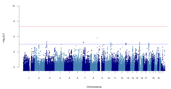Manhattan plot of the meta-analysis results of the five early childhood caries (ECC) genome-wide association studies (GWASs). The horizontal red line represents the genome-wide significance threshold (p = 5 × 10−8), and the horizontal blue line is the suggestive significance threshold (p = 1 × 10−5). Each point represents a variant tested for association with ECC. The x-axis is the genomic position of the corresponding variant, and the y-axis is the negative logarithm of the association p-value. Seven loci surpassed the suggestive threshold of association with ECC, and none surpassed the genome-wide significance threshold.