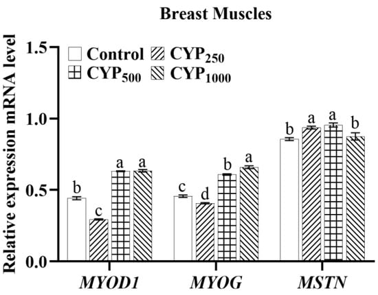 As shown in Figure 2, in breast muscle tissues, CYP500 and CYP1000 groups had higher MYOD1 mRNA expression compared to the control group (p < 0.05). Meanwhile, compared to the control group, the CYP500 and CYP1000 groups had higher MYOG expression, CYP250 and CYP500 groups had higher MSTN expression (p < 0.05).