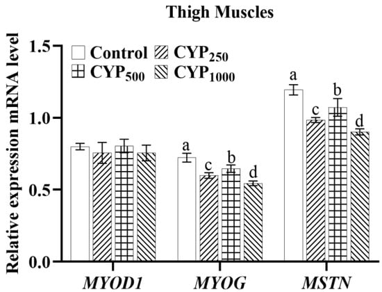 As shown in Figure 3, there was no difference in the expression of MYOD1 mRNA in the thigh muscle tissues of each group (p > 0.05), while MYOG and MSTN mRNA expression in CYP250, CYP500, and CYP1000 groups was significantly lower than that in the control group (p < 0.05). In addition, MYOG and MSTN mRNA expression of the CYP500 group was higher than that in the CYP250 and CYP1000 groups (p < 0.05).