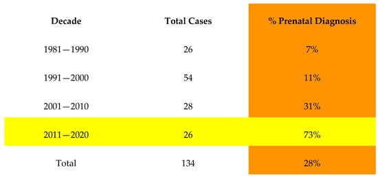 Between the years 1980 and 2020, there were 38/134 (28%) patients with 22q11.2DS who had a prenatal diagnosis of CHD (Figure 1). Fifty-eight percent of cases were detected in the last seven years of the study, between 2013 and 2020. In one case, there was prenatal detection of the VSD only and an echocardiogram performed shortly after birth identified IAA. Of note, there were 20 patients overall with a prenatal diagnosis of 22q11.2DS, and in each of those cases, the cardiac diagnosis prompted the genetic testing.