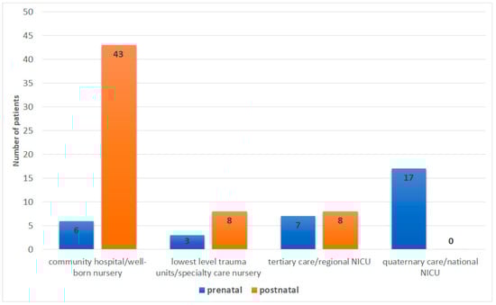 For this analysis, the cohort was divided into cardiac diagnoses made during the pregnancy (prenatal) vs. after delivery (postnatal). Hospital trauma level was ascertained for each known birth hospital []. There were data available regarding birth hospital trauma levels for 92 patients. Delivery at a quaternary center occurred exclusively in those with a prenatal diagnosis (17/17). Of the postnatal diagnoses, the majority were born at a community hospital (43/59 or 73%) (Figure 2).