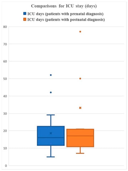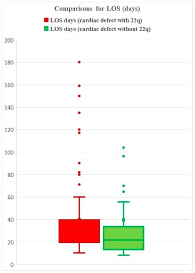 LOS was available for 85 patients with IAA and 22q11.2DS and 40 patients with IAA and without 22q11.2DS. Statistical comparisons were performed using the Wilcoxon rank sum test, with a p value 1.8 × 10−7. The mean LOS is 40 vs. 39 days, respectively (Figure 4). Of note, the higher average in the control group includes two outliers (224, 292 days). When removing the outliers and reanalyzing the data without the outliers, we observed a mean of 40 vs. 28 days for deleted v. non-deleted patients.