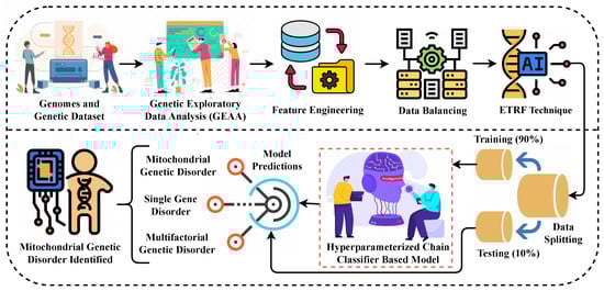 The genes present in the DNA carry important information that can explain the formation of the different types of proteins []. Some changes in the structural properties of the gene can result in the formation of an abnormal protein. The abnormal protein does not work properly in the cell. Such abnormalities in the DNA gene lead to different genetic disorders such as cancer [], diabetes, Alzheimer’s, etc. In 2020, 15,000 people were diagnosed with syndrome B disorder. About 100,000 children currently have syndrome B disorder while 12,000 people died from syndrome C disorder around the world []. Approximately 2% to 5% of all childbirths are diagnosed with genetic disorders [] that may lead to 5% to 50% of deaths in the childhood []. The genome data contain useful information and several health-related indicators that can be used to predict the genetic disorder. However, keeping in view the complex nature of the DNA data, the number of features, and the volume of the data, manual prediction is laborious, error-prone, and inefficient.