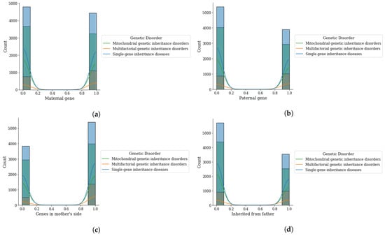 Analysis of inherited genes that cause the genetic disorder is given in Figure 4. The analyzed genes are based on the maternal gene, paternal gene, genes from the mother’s side, and inherited from the father. This analysis demonstrates that the genes are the prominent factors that are causing the genetic disorder. Analysis reveals that when the maternal and paternal gene value is 0 or 1 the mitochondrial disorder has a higher probability while single gene disorder has less chance of happening. Similarly, Figure 4c,d demonstrate that the mitochondrial disorder has a higher chance when the values of the genes on the mother’s side and inherited from the father are 0 or 1.
