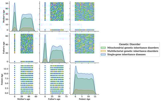 The age factor of patients is analyzed by the genetic disorder category and is visualized in Figure 6. The age of the mother, father, and patient is examined in this analysis. The analysis demonstrates that there are high chances of genetic disorders when the mother’s age is between 20 and 60 years. When the mother’s age is less than 20 years, the probability of a genetic disorder is low. A high chance of genetic disorder is associated with the age of the father begins between 20 and 70 years. By analyzing the patient’s age, the genetic disorder diseases occur within the 15 years. This analysis shows that age is an important factor that can be used to study genetic disorders.