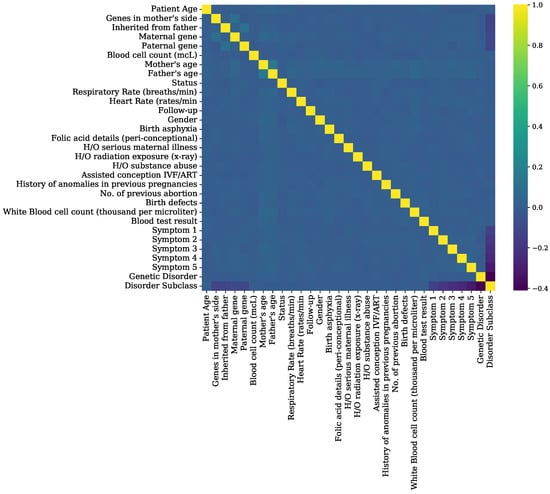 The genome and genetic dataset are based on the medical information of children and adult patients who have genetic disorders []. The type of dataset is multi-label multi-class. The first attribute of the dataset is genetic ‘disorder’ and the second sub-label is ‘disorder subclass’. The dataset contains a total of 44 attributes. The dataset-related information is analyzed in Table 2.