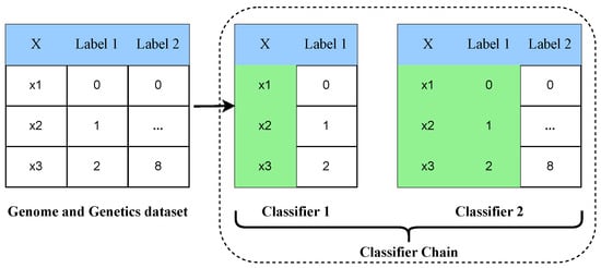 The genomes and genetics datasets that are utilized in this study are multi-label multi-class data. We solve the multi-label multi-class classification of genetic disorders and types of disorders as a subclass. For this purpose, the classifier chain approach is utilized for building multi-label multi-class machine learning techniques. The classifier preserves the label correlations in the dataset during the training and testing of models. A connected chain of multiple classifiers is created for a machine learning model. In the classifier chain technique, each model predicts in the order specified by the chain, and the earlier predictions of models in the chain are incorporated by the next models [,]. The classifier chain technique uses a chain of classifiers where each classifier uses all the previous classifier’s predictions as input. The total number of classifiers in the classifier chain is equal to the number of classes in the dataset used in this study []. The architectural analysis of the classifier chain approach is examined in Figure 8. The macro accuracy, α-evaluation score, and Hamming loss are the evaluation metrics that are used for multi-label multi-class data [,].