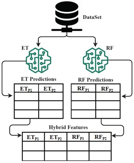 The novel ETRF technique is analyzed in this section. The ETRF approach is formed by combining the ET and RF algorithms. In this research, the ETRF technique is used as a feature extraction technique for learning model building and predicting genetic disorders []. The feature set formation and extraction mechanism from the genomes dataset by using the proposed ETRF technique is visualized in Figure 9. The architectural analysis shows that the genomes data samples are input to the ET and RF algorithms separately. The class predicted probabilities are extracted from the RF and ET techniques. A hybrid feature set is formed by combining the extracted class predicted probabilities. The hybrid feature set is later used as an input to applied learning techniques for predicting the genetic disorder and types of disorder.