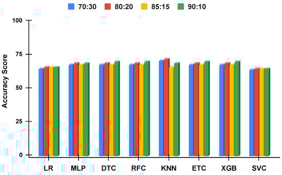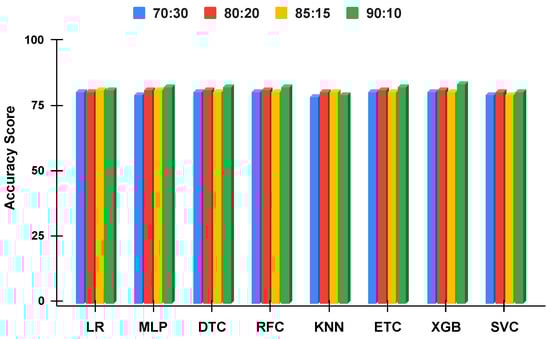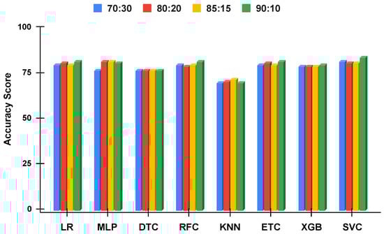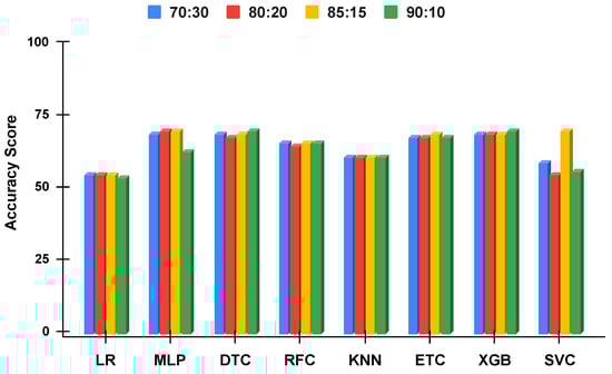 The accuracy score comparative analysis of applied machine learning techniques with a split of 70:30, 80:20, 85:15, and 90:10 is visualized. The imbalanced dataset accuracy comparative analysis results with and without using the proposed approach are examined in Figure 10 and Figure 11. By applying the data balancing, the comparative analysis of accuracy results with and without using the proposed approach is examined in Figure 12 and Figure 13. This analysis demonstrates the significance of our proposed approach by increasing the accuracy of the results.