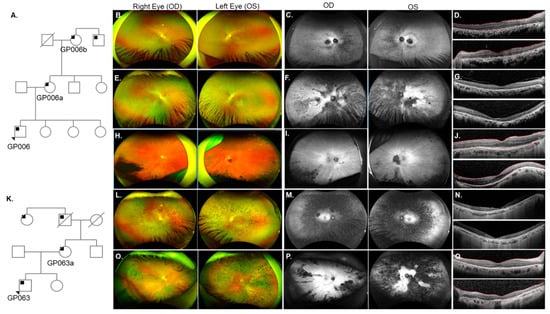A separate family (patient GP063 and his mother GP063a) also harbored a mutation in RP2 (Figure 2K). GP063 was diagnosed with RP at age 16 (Table S1) but nyctalopia onset occurred at 4-years-of-age. Bilateral cataracts were removed at age 21. GP063 had typical RP features (Figure 2L) and central hypo-AF surrounded by parafoveal hyper-AF (Figure 2M) which was concomitant with photoreceptor loss in the maculae (Figure 2N). The patient’s mother (GP063a) reported nyctalopia at age 16 and was diagnosed with typical RP (Figure 2O) at 30 years-of-age. FAF revealed multifocal areas of hypo-AF corresponding to regions of bone spicule formation on color fundus photos (Figure 2P). Loss of the EZ was seen temporally OD (oculus dexter or right eye) whereas OS had almost complete loss of the photoreceptors (Figure 2Q). Genetic testing for this family revealed a novel RP2 mutation c.413A>C (p.Glu138Ala). A pathogenic mutation has been reported previously at the same codon [87,88,89].