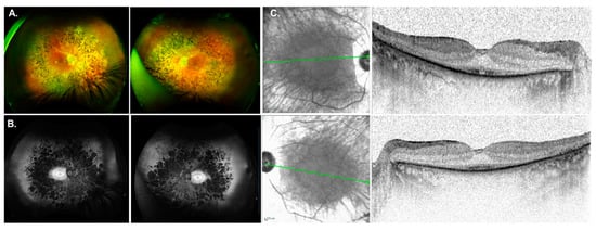 Another interesting case included patient GP037, who was diagnosed with isolate RP at age 30 with nyctalopia onset at 12-years-of-age. Her medical history included hypertension, diabetes, chronic renal insufficiency, gout, and gastric bypass. Fundus images were symmetrical OU showing chorioretinal atrophy, RPE changes in the macula and typical RP features (Figure 3A). FAF showed atrophic midperipheral hypo-AF, PPA, and a bullseye pattern of AF (Figure 3B). SDOCT imaging was notable for outer retinal atrophy with foveal preservation of the EZ (Figure 3C). Four generations of family history revealed no relatives with visual problems (pedigree not shown). Genetic testing reported a pathogenic mutation c.625C>T (p.Arg209*) and a variant of uncertain significance (VUS) c.712A>G (p.Lys238Glu) in the gene CEP83. The VUS Lys238Glu is a missense DNA change encoding a moderately conserved nucleotide present in 8 of 12 total species. ClinVar (2022-02-05, 1005895) classifies this variant with uncertain significance for Nephronophthisis. This information expands the phenotype of IRD for the CEP83 gene which has only been reported in 2 other individuals [58,59] and is discussed below.