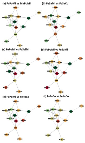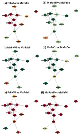 Gene networks for the cAMP signaling showcasing group contrasts presenting a wide range of gene expression changes across the network. Nodes represent the genes; edges represent STRING database connections confirmed by the study; node color represents differential expression between groups. The first letters of the contrasts label denote the sex (Ma = male vs. Fe = female), followed by the postnatal stressor (Sa = saline vs. Po = Poly(I:C) vs. Fa = fasting), and the ending letters denote the maternal immune activation group (Co = non-MIA controls vs. Mi = MIA PRRSV-exposed animals). Colors range from red (under-expression in the first group vs. the second group) to yellow (neutral fold change value) to green (over-expressed in the first group vs. the second group.