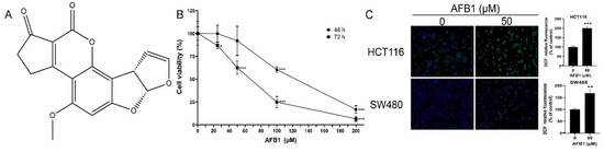 (A) The chemical structure of AFB1; (B) cell viability of HCT116 cells treated with AFB1; (C) representative fluorescence images of ROS accumulation and quantification analysis of fluorescence intensity. * p < 0.05, ** p < 0.01 or *** p < 0.001 indicates statistically significant difference.