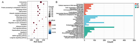 KEGG and GO enrichment was performed using the DAVID bioinformatic database. The GO enrichment analysis contained subtypes of biological process (BP), cellular component (CC), and molecular function (MF). KEGG of 2289 overlapping genes was involved in the cell cycle, endoplasmic reticulum (ER), autophagy, tight junction, mitophagy, and apoptosis (Figure 4A). The BP terms were cell cycle, autophagy, and response to ER stress. The CC terms included focal adhesion, cell junction, mitochondrion, and ER lumen. The MF terms contained cadherin binding (Figure 4B).