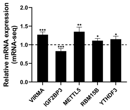 Through the analysis of mRNA-seq data, a total of 23 mRNA of m6A regulators were differentially expressed (Table S2 and Figure 7). The writers VIRMA, METTL5, RBM15B, and ZC3H13 were upregulated, and the reader IGF2BP3 was downregulated (Figure 7). The mRNA expression of IGF2BP3 has been verified by RT-qPCR in AFB1-treated HCT116 and SW480 cells (Figure S1).