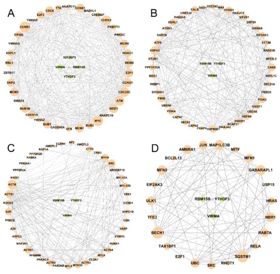 The interactions between m6A regulators (green circle) and the genes (orange circle) from the KEGG enrichment pathways of (A) cell cycle, (B) ER, (C) tight junction, and (D) mitophagy.