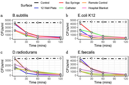 We tested four distinct bacterial species commonly found in the hospital environment (E. coli strain K12, E. faecalis, B. subtilis, and D. radiodurans) for their susceptibility to ozone. These bacteria were grown and tested in triplicate on four high-traffic surfaces from the hospital equipment: catheters, blankets, hospital remote controls, and syringes, with positive and negative controls, also included for comparison. All samples were treated with the same ozone dose at increasing lengths of time (30, 60, and 120 min), and CFU counts were compared between ozone-treated and control groups. Control experiments consisted of allowing bacteria to grow without ozone treatment and then collecting samples as outlined in the Methods for each of the time points. Each surface and species tested colony forming units (CFUs) were counted, CFU/mL calculated, and the triplicates were averaged with the standard error of the mean calculated to obtain ozone kill curves (Figure 1). These results showed as much as three-log-fold changes in CFUs at the 1 h and 2 h time points, with most cases of of CFU counts halved within the the first 30 min of treatment.