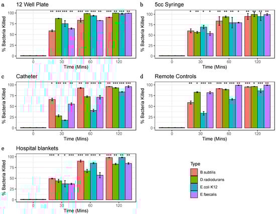Percent Bacterial Reduction. Bacterial percent reductions for B. subtilis (red), E. coli K12 (green), D. radiodurans (blue), and E. faecalis (purple) from ozone treatment (20 ppm). Error bars represent standard error of the mean from triplicate experiments on a variety of surfaces: (a) 12 well plates (b) syringes (c) catheters, (d) remote controls (e) hospital blankets. Bacteria species at each time point were compared to corresponding control 0 min (Significance codes 0.001 ***, 0.01 **, 0.05 *, Student’s paired t-test).