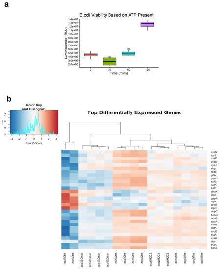 All reads were mapped to the E. coli K12 substrain MG1655 reference genome downloaded from Bacteria ENSEMBL using the STAR (ver 2.7) Aligner []. The Bioconductor package EdgeR [] was used to normalize data and perform differential expression analysis between treated samples and non-treated controls with the |Log2FC| > 1.5 and adjusted p value < 0.05 thresholds. The results were visualized in R with a hierarchical clustered heatmap generated for the top 30 differentially expressed genes, and volcano plots displaying top upregulated and downregulated genes using above thresholds. Gene Ontology analysis for the differentially expressed genes was conducted using TopGo []. Fisher analysis was used to test each GO category independently along with a Classic Kolmogorov–Smirnov test for enrichment for 24 terms scored with p < 0.01.