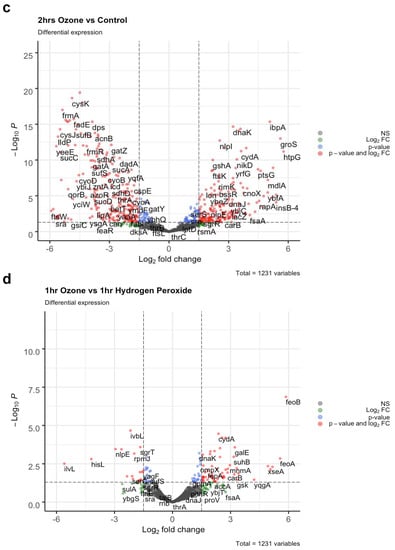 To ensure gene transcripts from live bacteria were sequenced, cell viability of E. coli K12 was assessed immediately after ozone treatment via presence of ATP luminescent signal as CFU counts do not provide insight into bacterial death right away. No significant difference in viability was seen for the 30 min and 1 h time point but at 2 h there was a significant increase in ATP presence (p < 0.01 Student’s paired t-test) (Figure 3a). Hierarchical clustering of gene transcripts revealed tight clustering of stress response genes at each time point in E. coli K12 in response to ozone treatment, with 263 genes downregulated and 184 upregulated as determined by a |Log2FC| > 1.5 (Figure 3b). Many of these top-upregulated expressed genes were typical of E. coli K12′s response to oxidative damage, such as the reactive oxygen species (ROS) scavengers SodA, AhpC, and KatG []. Other genes of interest include the DNA binding protein Dps, which acts as a physical protectant of DNA during stress response but also collects iron to act as a reducing agent under oxidative stress []. Heat shock response genes such as DnaK, IbpB, and IbpA were also shown to be upregulated []. Differential gene expression for 2 h of ozone treatment vs. no treatment were also visualized with a volcano plot using|Log2FC|> 1.5 and p cutoff = 0.05. Here, we observed an upregulation of heat shock response genes DnaK and IbpA [], and a downregulation of DNA oxidative damage response gene Dps [] (Figure 3c). A volcano plot for the comparison of 1 h of ozone treatment to 1 h of H2O2 treatment revealed key differences in stress response gene activation between the two types of oxidative damage such as the upregulation of ferrous iron transport genes feoA and feoB [], cytochrome oxidase cydA [], and again heat shock response and protein repair gene DnaK [] (Figure 3d).
