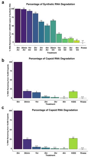 RNA from non-replicative capsid enclosed SARS-CoV-2 showed significant degradation 30 min into ozone treatment as could be reliably detected by 10,000 copies of virus (p < 0.001) and 1000 copies of virus (p < 0.001) (Table 2). 100 uM of H2O2 treatment for 1 h also produced significant degradation according to Ct values obtained compared to 0 h treatment (p < 0.001 for both 10,000 and 1000 copies of virus), and RNA degradation was still comparable to 1 h of ozone treatment, p = 0.99. For 10,000 copies of the virus, the percent of log fold intact amplifiable treated RNA left over compared to 0 h control treatment representing 100% of RNA was 19.33%, 15.72%, 4.03%, 2.34%, 0.49% for 30 min, 1 h, 2 h, 3 h, and 4 h of ozone treatment, respectively. 1 h of H2O2-treated RNA left over was 18.02%, and RNase-treated samples represented thoroughly degraded RNA with 0% RNA left (Figure 4b). One thousand copies of the virus showed similar results to the 10,000 copies of the virus tested. The percent RNA log fold change of ozone-treated samples compared to 0 h was 25.58%, 5.46%, 3.43%, 1.61%, and 1.01% for 30 min, 1 h, 2 h, 3 h, and 4 h of ozone treatment, respectively. H2O2 treated samples were 28.06% degraded after, and RNase representing complete degradation was 0% (Figure 4c). Mean Ct values were obtained along with Ct standard deviation. To obtain changes in degradation, delta Ct values were calculated as either treatment or timepoint mean Ct subtracted from 0min control mean Ct. From this, RNA fold-change vs. control was calculated as 2−∆Ct as the difference between one cycle reflects a 2-fold difference in starting transcript level [,].