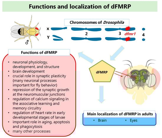 - Specchia, V.; D’Attis, S.; Puricella, A.; Bozzetti, M.P. dFmr1 Plays Roles in Small RNA Pathways of Drosophila melanogaster. Int. J. Mol. Sci. 2017, 18, 1066. [Google Scholar] [CrossRef] [PubMed]