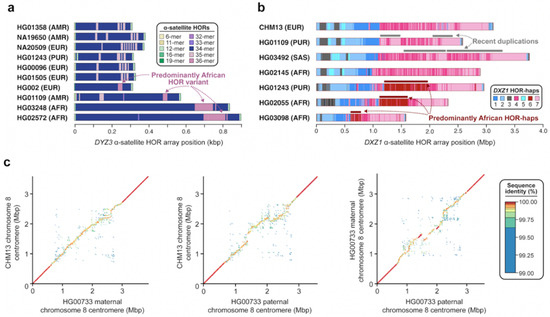 Sequence and structural variation within centromeric α-satellite HOR arrays. (a) Plots showing the structure of the chromosome Y DYZ3 α-satellite HOR array in ten diverse human genomes, highlighting the presence of a 36-mer α-satellite HOR variant in four haplotypes (HG002, HG01109, HG03248, and HG02572) [76]. (b) Plots showing the α-satellite HOR haplotypes (HOR-haps) present in the chromosome X DXZ2 α-satellite HOR array in seven diverse human genomes. Two genomes (HG01109 and HG03492) harbor a haplotype with a recent duplication, while three others (HG01243, HG02055, and HG03098) harbor a haplotype that is especially prevalent among those with African ancestry. Adapted from [44]. (c) Plots showing the pairwise sequence identity between chromosome 8 centromeric regions from three human haplotypes (CHM13 and two haplotypes from HG00733). The D8Z2 α-satellite HOR array shows variation in sequence and structure, while the flanking sequences do not. Adapted from [42].