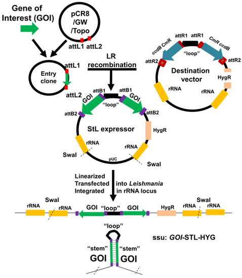 Flowchart for generation of entry and StL constructs using Gateway site-specific recombinase technology followed by introduction into Leishmania to express dsRNA. A stem for each GOI (gene of interest) was amplified by PCR and then cloned into pCR8/GW/TOPO vector (Invitrogen) to generate an “entry” clone bearing a flanking attL1 and attL2 sites for recombination-based transfer. The pIR-GW destination vectors bear two opposing ccdB/CmR cassettes, each flanked by attR1 and attR2 sites. Following site-specific recombination by the Gateway LR reaction, the desired StL for each GOI was obtained and confirmed. For biological tests, each StL DNA was linearized with SwaI, electroporated into Leishmania, where it integrated into the small subunit ribosomal RNA locus (SSU). There it is transcribed by the strong rRNA pol I promoter to generate RNAs whose dsRNA regions are processed by the RNAi machinery.