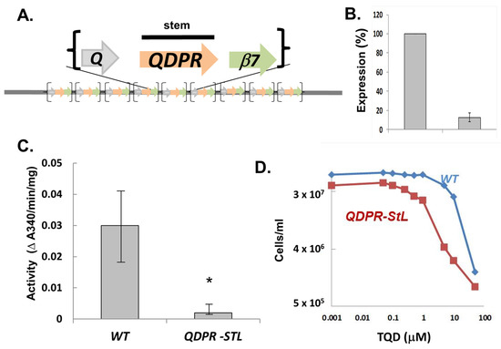 3.3. StL-Mediated Specific RNAi of the Metabolic Target Quinonoid Dihydropteridine Reductase (QDPR) Interspersed within a Tandem Repeated Gene Array