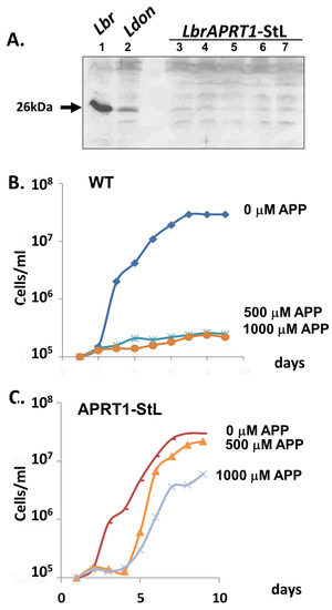 First, we introduced an APRT1-StL construct into WT Lbr, where transfectants were readily obtained and grew normally. Western blot analysis confirmed significant reduction to undetectable level in APRT1 expression (Figure 6A). Unlike WT parasites whose growth was completely inhibited by 500 µM APP, LbrAPRT1-StL transfectants were able to grow at the highest concentration tested, albeit at reduced growth rates (Figure 6B,C). Other studies showed that the APP EC50s were 50–100 μM for WT and 500–1000 μM for APRT1-StL (not shown). Thus, RNAi knockdown of APRT1 leads to APP resistance as expected.