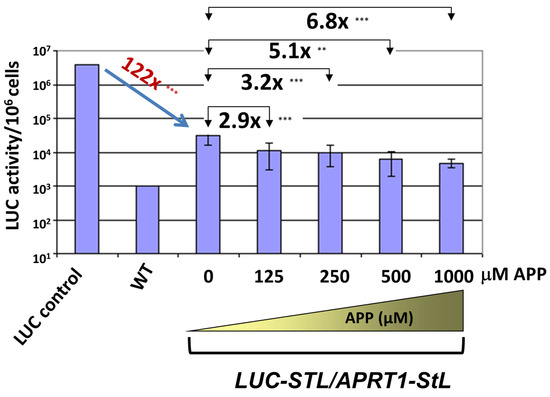 In the absence of APP selection, luciferase expression was reduced 122 fold in the APRT1-StL+LUC-StL/LUC parasites (Figure 7), slightly less than the 200–300 fold reduction seen previously [10] but greater than the 30–50 fold seen in Figure 2B with similarly sized stems. These experimental series were performed months or even years apart, and we suspect small differences in vector design or clonal variation may be a contributing factor. Since each series of experiments was internally controlled, we consider these differences of neglible significance in this context.