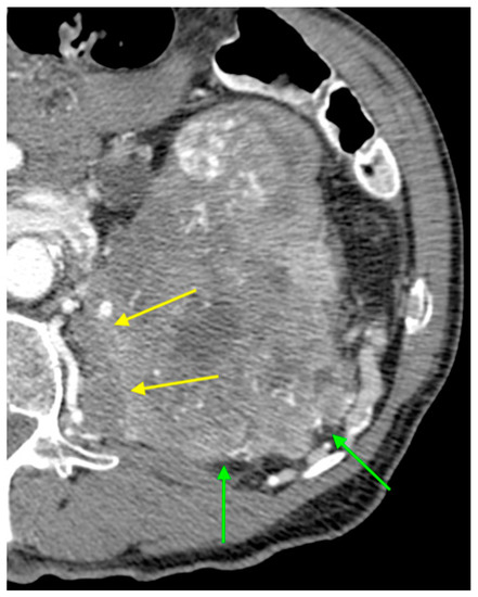 Axial CT image during arterial phase showing ccRCC with GIMAP genes expression with absence of endophytic growth pattern (green arrows) and signs of infiltration of the left psoas major muscle (yellow arrows).
