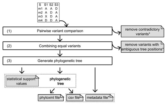 Workflow of the SNPtotree algorithm. An input file of the ancestral (A) or derived (D) allelic states of the polymorphic sites is required. Missing data should be indicated using an “X”. The header row represents the individuals’ labels (S1, S2, and S3), and the first column represents the variant names (m1, m2, m3, and m4). The algorithm consists of three steps: first (1), all pairs of variants are compared to each other to predict the pairwise relationships. Variants with contradictory relationships are removed. Second (2), variants that are not separable are predicted to be equal. During the process of finding equal variants, variants with ambiguous positions in the tree are removed. Finally (3), the hierarchical variant order is inferred, and the phylogenetic tree is generated. Additional output files (see Section 2) provide the statistical support values for each variant in the tree, and metadata specifies the sequences carrying the respective variants in the different branches of the csv output tree. Optional output files are marked with an asterisk.