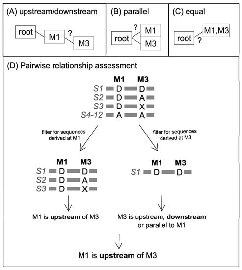 The initial step in establishing a phylogenetic tree of variants is to determine the hierarchical order of each pair of variants. Using the example dataset presented in Table 1, it is demonstrated whether the variants M1 and M3 are located downstream/upstream of each other (Figure 2A), parallel to each other (Figure 2B), or equal/not separable (located on the same branch) (Figure 2C). To establish this relationship, the allelic states between variants M1 and M3 are compared among all sequences in a two-way pairwise comparison (Figure 2D). Firstly, all sequences in which M1 is in the derived state are considered. For these sequences, the observations in M3 (derived, ancestral, and missing data) can be used for a preliminary assessment of the pairwise relationship between the two variants. This assessment follows the rules presented in Table 2 of observable allelic states in variant 2 when considering only sequences with a derived variant 1. In the example presented, for sequences with a derived allelic state of variant M1, the allelic state of M3 is derived, ancestral, or missing, which indicates that M1 is upstream of M3 (Figure 2D, Table 2). When repeating the comparison, considering sequences with derived allelic states in M3, M1 is found in the derived state, indicating equal upstream or downstream relationships. Finally, the consensus between both assessments is that M1 is upstream of M3. For some variant pairs, however, the information may not be as clear. For example, in cases where the available data was not able to fully ascertain the hierarchy of the variants, the relationship between two variants will be characterized as “equal”. Adding more data (e.g., re-typing sequences) could potentially help to resolve the hierarchy of variants.