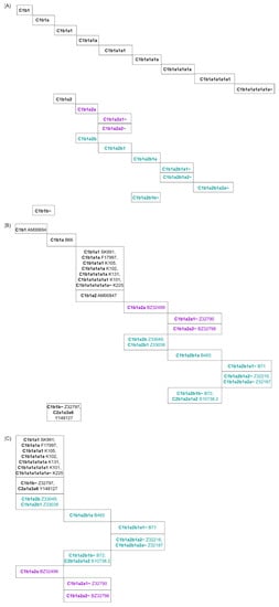In both generated SNP phylogenies (Figure 5B,C), some SNPs were located in unexpected positions of the tree, e.g., S10738.2 (clade C2b1a2a1a2) and Y148127 (clade C2a1a3a6) were located within the C1b1 clade (Figure 5B,C). These may be recurrent mutations in all individuals or sequencing errors that were not filtered out since they did not cause contradictory relationships between markers or ambiguous positions.