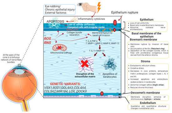 Cascade of molecular processes in the pathophysiology of keratoconus. Summary of the molecular involvement of the corneal layers. The presence of external factors, such as eye rubbing, increased reactive oxygen species (ROS), mitochondrial damage or mutations in certain genes, can lead to the activation of biochemical cascades that first induce the loss of cellular uniformity in the corneal epithelium. The process continues with the inflow of epithelial cells into Bowman’s membrane, leading to its rupture and the accumulation of ferritin in the area, which clinically translates into the clinical sign of Fleischer’s ring. There is an increase in proinflammatory cytokines (IL-6, TNF-alpha) and an exacerbation of the function of metalloproteinases (MMP-1, MMP-2, MMP-9, MMP-13), resulting in the separation of collagen bundles and their abnormal arrangement (clinically perceived as Vogt’s striae), increased apoptosis of keratocytes, leading to a reduction in corneal stromal thickness, and both histological changes and disruption of the extracellular matrix. Created with Biorender.com (accessed on 29 August 2023).