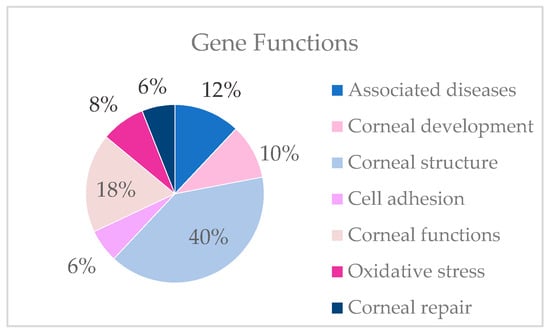 Variants in genes involved in the maintenance of the composition of the different layers that compose the cornea have been related to keratoconus. All corneal layers present a common and predominant structural component, collagen, and thus, variants in genes involved in collagen synthesis have been described that result in a decrease in stromal collagen, mainly type I, II and IV collagen. Variants have been detected in COL4A3 and COL4A4 genes [1,6,25]. In addition, as 10–20% of total corneal collagen is collagen V, mutations in the genes coding for its α1 and α2 chains, COL5A1 and COL5A2, respectively, have been associated with corneal thinning and keratoconus [12,26]. Likewise, variants have also been described in genes involved in the proteolytic processing of collagen, such as BMP1, responsible for the proteolysis of pro-COL5A1 [1]. ZNF469 has been described as a candidate gene for its function as a transcription factor in the synthesis and organization of collagen fibers [1].