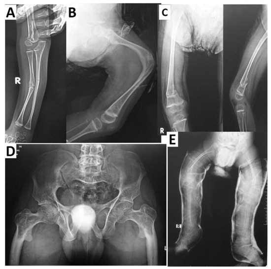 Radiological findings in four patients with OPPG. Multiple fractures and deformities at a young age are typical in OPPG. (A) Patient with mid-shaft fractures of the right radius and ulna. (B) The same patient displaying an approximately 90-degree angulation deformity in the mid-femoral diaphysis with co-existing deformity of the distal metaphysis. (C) Another patient displaying coxa valga and a varus angulated fracture at the distal femoral metaphysis. (D) A patient displaying bilateral coxa vara and lytic proximal femora, with disorganized tensile and compressive trabeculae and diaphyseal sclerosis. (E) Another patient in bilateral lower extremity casts secondary to bilateral femur fractures exhibiting coxa valga, very thin long bones, and bowing of the femora. Adapted with permission from Ref. [39]. 2022, Osteoporosis International.