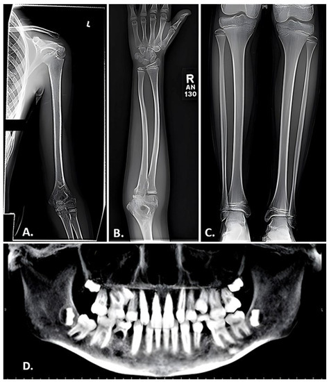 The presentation of LRP5 variant-induced FEVR is extremely variable, with some patients remaining asymptomatic throughout their lifetime and others experiencing multiple fragility fractures from a young age and ocular consequences leading to vision loss or even blindness. Our group previously reported on the skeletal characteristics of two pediatric siblings found to have LRP5 variant-induced FEVR [51]. Both siblings had significantly reduced bone density, gracile long bones, and widened medullary canals with thin cortices. One sibling was also noted to have coxa valga and the other had impaired dentinogenesis of five adult teeth (Figure 2) [51]. Both also suffered multiple fragility fractures from a young age (Figure 3 and Figure 4). Though our report described aspects of the skeletal phenotype in these patients, there is a need for further research outlining the skeletal phenotypes of other patients with LRP5 variant-induced FEVR, as much of the current literature focuses on the ocular manifestations of the disorder.