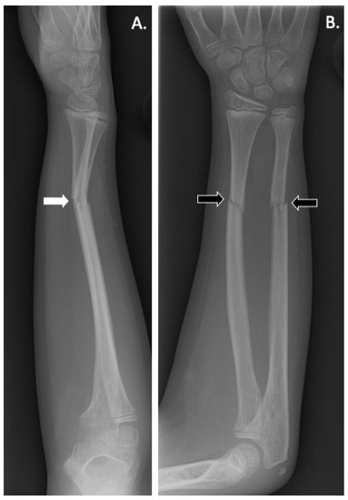 (A) Lateral and (B) anteroposterior radiographs of the right forearm of a patient with LRP5 variant-induced familial exudative vitreoretinopathy (FEVR) showing radial and ulnar fractures (black arrows). Angulation is noted on the lateral X-ray (white arrow) suggesting possible instability and loss of physiological position.