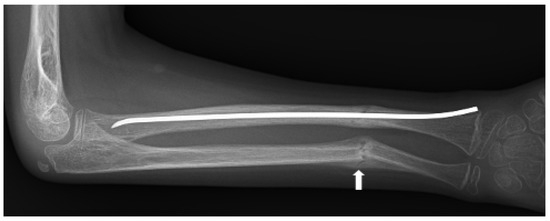 Anteroposterior radiograph of right radial and ulnar fractures of a patient with LRP5 variant-induced familial exudative vitreoretinopathy (FEVR). The fractures, which were initially undisplaced (Figure 3), became angulated, encroaching upon the interosseous space and potentially limiting supination and pronation. Preservation of rotational motion of the forearm was achieved by intramedullary rodding of the radius, restoring physiological alignment. Fracture callus is seen at the ulnar fracture (white arrow). Due to the young age of the patient, the residual angulation of the ulna underwent remodeling to a physiological position.