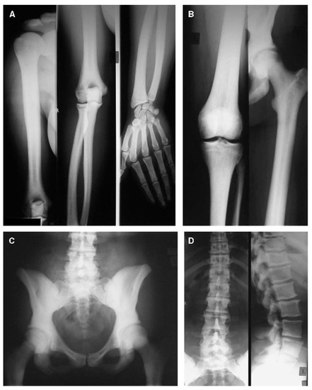 The first disorder known to be caused by LRP5 variants was OPPG (OMIM 259770 [2]), which was determined to stem from autosomal recessive loss-of-function pathogenic variants [3]. The skeletal characteristics associated with OPPG include severe osteoporosis, extremity deformities, compressed vertebrae, kyphosis, bowing of the long bones, predisposition to fracture (with many patients suffering multiple fractures from a young age), and thin cortices with enlarged metaphyses (Figure 1) [36,37]. Wormian bone has been observed in at least one case report [38].