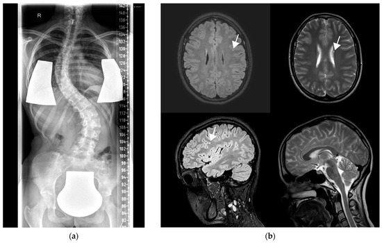 (a) X-ray showing scoliosis in patient 2 at the age of 17 years. (b) Brain MRI in patient 2 at the age of 17 years with left frontal FLAIR hyperintensity (upper left axial and lower left sagittal images), periventricular cyst (upper right axial) but no other abnormalities (lower right sagittal).