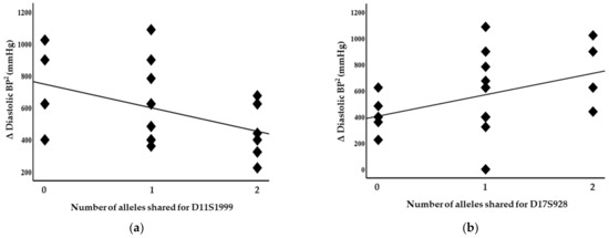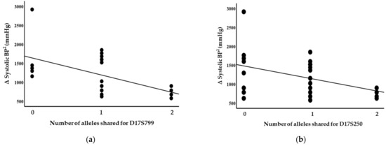 A statistical analysis was performed using SPSS software (version 28.0) to determine the relationship between blood pressure and the microsatellite markers (correlation and multiple regression analyses) and for graphical illustration. The data were also analysed using the Haseman–Elston quantitative trait loci regression method in which the squared difference in the phenotype (here, blood pressure) between sibs is regressed to the number of alleles shared by identity-by-descent (IBD) and by the use of the SPLINK package, a non-parametric likelihood ratio method. Since this was a small study of 24 sib pairs, correlation coefficients and unadjusted p-values are presented, and a p-value of <0.05 was considered statistically significant.